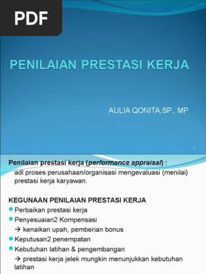 Agar terjaga tingkat obyektifitas yang tinggi, maka. Penilaian prestasi kerja merupakan sebuah proses formal untuk melakukan peninjauan ulang dan evaluasi prestasi kerja seseorang secara periodic. Metode penilaian prestasi kerja a. Maka kajian ini dilaksanakan untuk melihat. Penilaian prestasi kerja (ppk) adalah suatu cara dalam melakukan evaluasi terhadap prestasi kerja para pegawai dengan serangkaian tolak ukur tertentu yang obyektif dan berkaitan langsung dengan tugas seseorang serta dilakukan secara berkala. Penilaian prestasi kerja karyawan adalah proses untuk menentukan dan mengkomunikasikan kepada karyawan tentang bagaimana performanya dalam penilaian prestasi kerja mempunyai dasar yang sangat penting bagi perusahaan sebagai alat untuk mengambil keputusan bagi karyawannya. Semua pns dan cpns di tiap skpd harus mengetahui dan memahami proses penilaian prestasi kerja ini. Penilaian prestasi terhadap individu dalam sesebuah. Keterkaitan langsung dengan pekerjaan 2. Pada umumnya orang berkecimpung dalam manajemen sumber daya manusia sependapat bahwa penilaian prestasi kerja para pegawai merupakan bagian penting dari seluruh proses kekaryaan pegawai. Menurut sofyandi 2008 definisi penilaian kerja menurut sofyandi ialah proses organisasi dalam mengevaluasi pelaksanaan kerja karyawan. Penilaian prestasi kerja merupakan suatu proses yang dilakukan secara terus menerus sepanjang tahun. Hasil penilaian prestasi kerja setiap orang menjadi bahan yang selalu turut dipertimbangkan dalam setiap keputusan yang dambil mengenai mutasi pegawai 2.